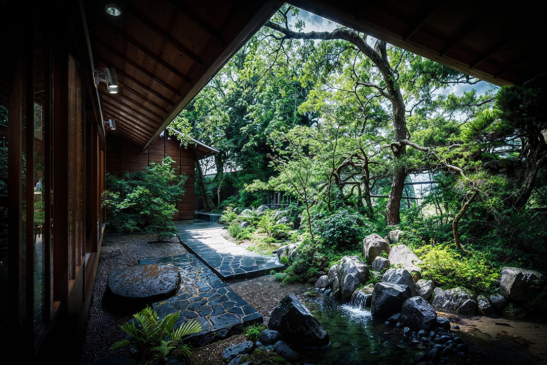 - 「和」のテイストを大切にしつつ、とにかく素敵な絵に仕上げてほしいとの要望をいただきました。建物のデザインだけでなく外的環境の表現も意識し、木漏れ日の落ち方や建物の重厚感が伝わるよう光と陰影を調整しました。特に中庭の自然な植栽表現にも配慮し、全体としては爽やかすぎず落ち着いた雰囲気になるよう仕上げています。今回制作に使用したD5 Renderの最新アセットを活用したことで、日本庭園の豊かな植栽選定を叶えています。