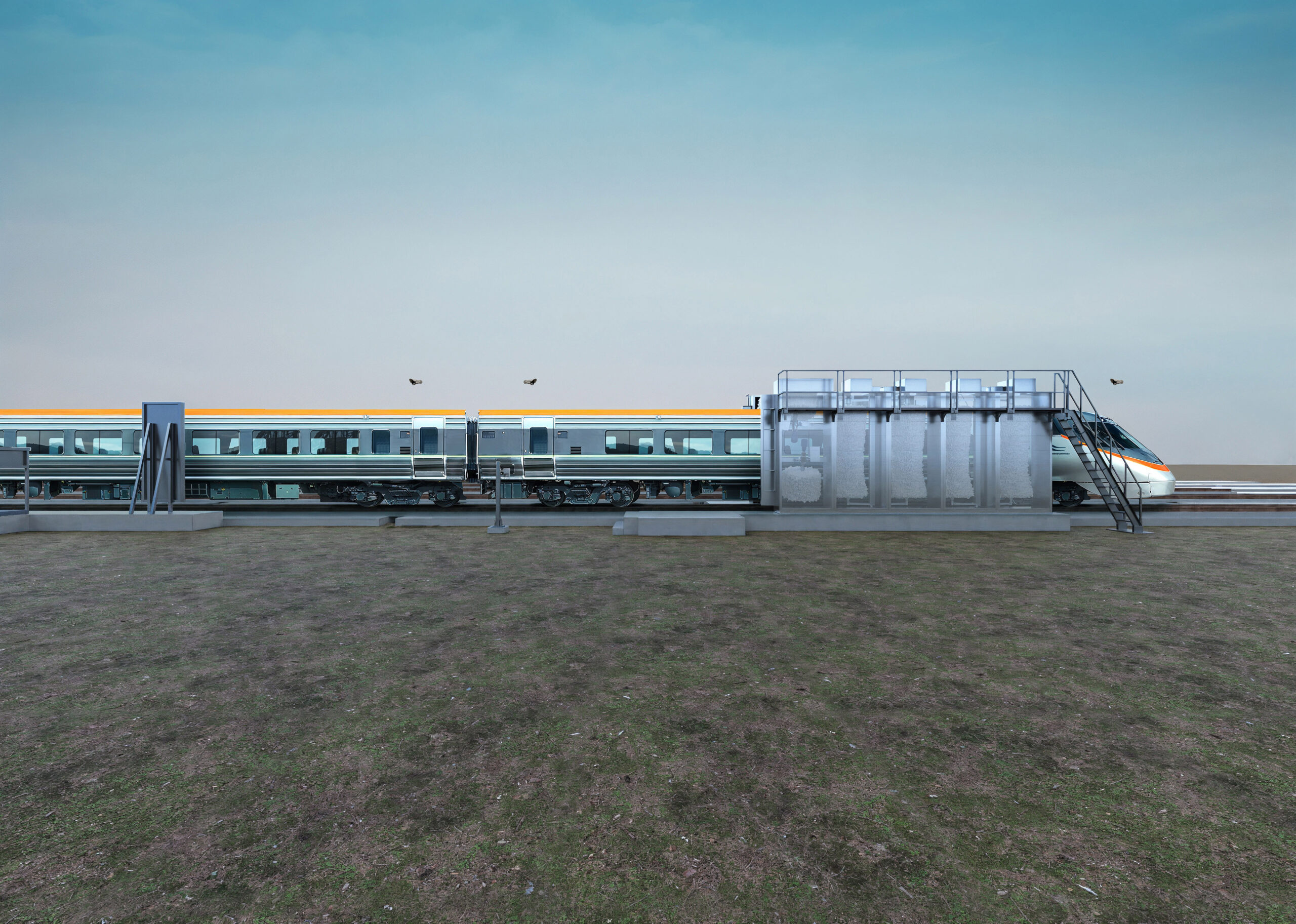 - 四国鉄道機械株式会社様の製品案内カタログに掲載する「車両洗浄システム」のCGパース制作です。洗浄システムを使用中の車両を含めた様々なカットに収め、機械の性能と製品の魅力が直感的に伝わる、利用イメージが明確に分かりやすいビジュアルを目指しました。
